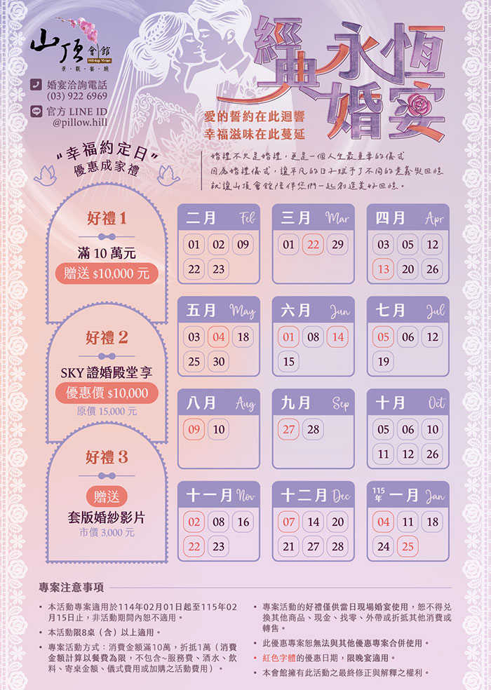 - 專案活動方式:消費金額滿10萬,折抵1萬(消費金額計算以餐費為限,不包含~服務費、酒水、飲料、寄桌金額、儀式費用或加購之活動費用)